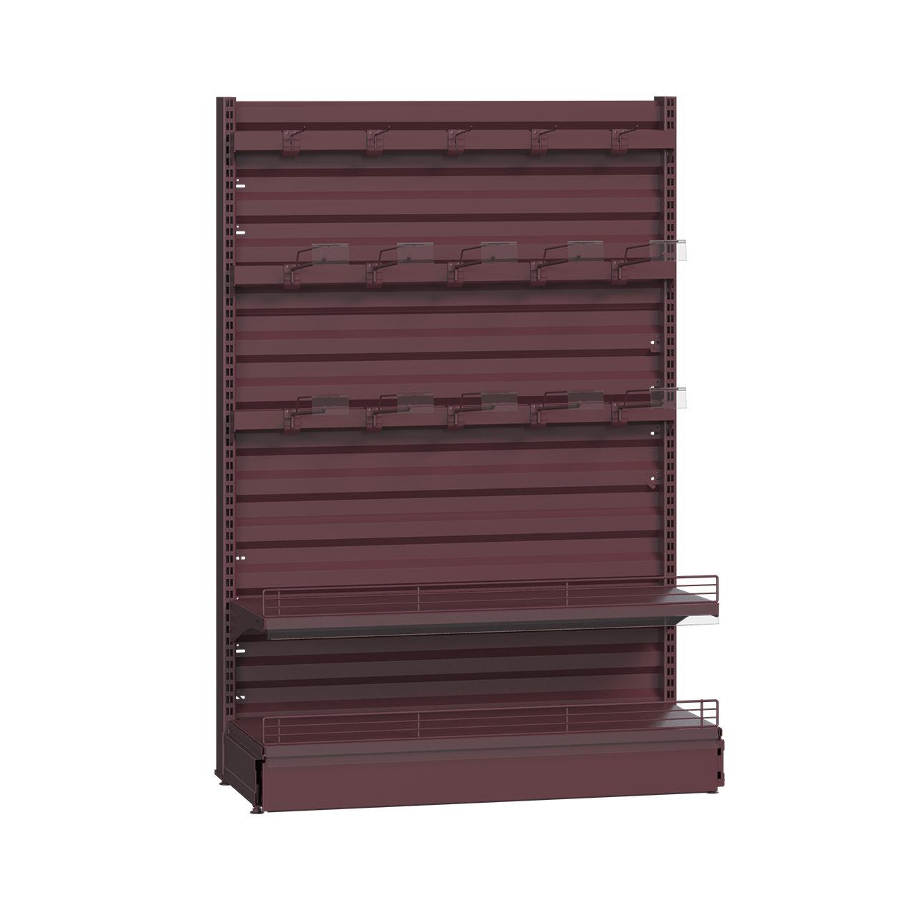 The FS System is designed to optimise retail layouts with a middle back panel configuration that increases display capacity and stability. The panel supports a wide range of merchandising accessories, allowing shelves, hooks, and brackets to be mounted at multiple heights.